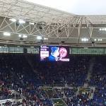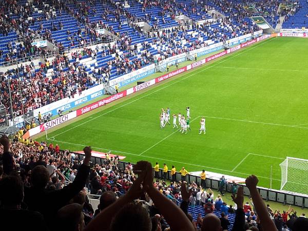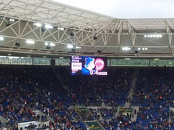 Alles in allem fiel der Ausflug bislang in die Kategorie „Gemütlich“. Ein weiterer Tunnel führte uns neben den Parkplätzen an die Arena, die hochoffiziell Wirsol Rhein-Neckar-Arena heißt und sich direkt an der Autobahn gegenüber dem Technik-Museum befindet. Stefan wanderte weiter zu den Stehplätzen, Pia, Berge, Christian und ich erklommen die Stufen zu den Sitzplätzen, man nimmt ja, was man bekommen kann und alsbald hockten wir nebeneinander mittig hinter dem Tor, umringt von jeder Menge Eintrachtler, die fortan auch den Ton angaben – und zwar in jeder Beziehung. Zuvor wurde noch der Text des Hoffe-Fan-Songs eingeblendet (Neiderei und Lästerei gehen uns am … vorbei …) der dennoch nicht mitgesungen wurde. Als die Fahnenschwenker dann auf dem Platz mit den Fahnen wedelten, erklang das Badener Lied – und auch dieser Text wurde eingeblendet. Tradition verpflichtet. Später zogen die Fans hinter dem Tor zwei Blockfahnen auf: Hurra, das ganze Dorf ist da. Mögen sie dies demnächst wieder gegen Pfullendorf machen.