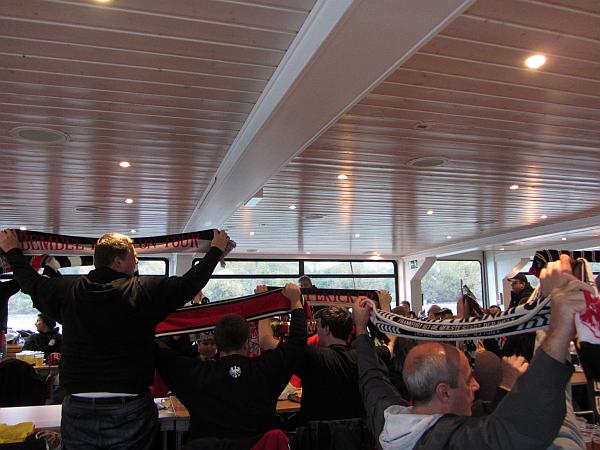 Zwei Schiffe dümpelten am Ufer, eines von der FuFa, eines von den Fanclubs. Da Niko uns Karten für Schiff und Spiel organisiert hatte, enterten wir das Boot der Fanclubs, hier ein Hallo, dort ein Gude Wie, viele waren müde und manch einer noch gedanklich in Israel. Wir bahnten uns den Weg nach unten, schusch hing am DJ Pult in den Seilen, hier saßen Kine und Petra und seit einiger Zeit mal wieder Annika und Domenico, während wir uns zu Ariane, Niko und Johannes an den Tisch setzten. Von Vorfreude war wenig zu spüren, allen steckten die vergangenen Niederlagen in den Knochen, selbst Pia musste mehr oder weniger zart aufs Schiff geschubst werden. Wir befanden uns nun auf der Nautillus, vor uns fuhr das Wappen von Frankfurt, dort waren Kommando Westend, Bembelbar und Schobberobber mit dabei. Zumindest wehten deren Fahnen an der Reling.
