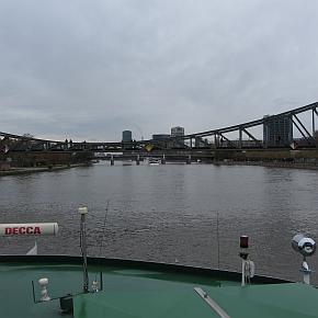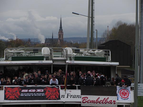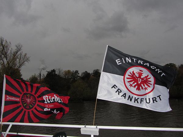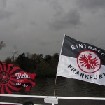 Ich wanderte hoch aufs Deck, die Reise begann. Wir durchquerten den Eisernen Steg, hielten Kurs aufs Äbbelwoiglas und tuckerten Richtung Höchst. Längere Aufenthalte auf Deck waren ungemütlich, eine Zigarette, ein Plausch, schon gings nach unten, dort wars warm. So ging es eine Zeitlang, mal ein Schöppchen besorgen, mal ein Kippchen rauchen, mal ein Schwätzchen halten und mal nach draußen gucken. Von Zeit zu Zeit winkten Eintrachtler am Ufer, oder auf den Schleusen, und ab und an stand ein Polizeiauto im Gebüsch und beäugte uns misstrauisch. Alleine auf der Fahrt hatte ich mehr Polizei gesehen, als während der kompletten Israeltour. Mit steigendem Bierkonsum hob sich die Stimmung, jedoch keinesfalls überborden. Schals wurden nach oben gereckt, im Herzen von Europa gesungen.