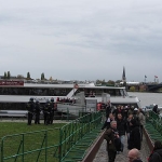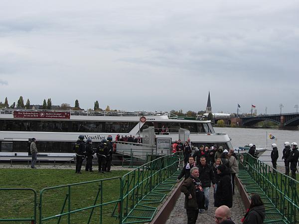 Als wir in Mainz ankamen, umkreiste uns ein Polizeiboot, ein weitaus größeres Aufgebot erwartete uns an Land. Doch zunächst mussten beide Schiffe noch eine ganze Weile auf dem Rhein treiben, bis wir anlegen durften. Oben auf der Brücke Rennerei – doch es war harmlos, ein Volkslauf führte heute durch Mainz. Dann verließen die Eintrachtler das Wappen von Frankfurt, anschließend waren wir dran, hasteten durch die Absperrgitter, Pia hatte Ariane im Schlepptau. In Sichtweite Polizei und Shuttlebusse, auf die wir gar keine Lust hatten. Wir trafen ZoLo und Axel, scheinbar ging ein Böller in die Luft, von daher hieß es: Ab in die Busse.
