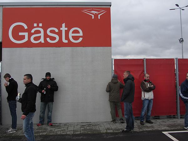 Wir machten einen kleinen Rundgang durch die Stadt und fragten einen Mainzer Fan (erkennbar an der Kappe) nach dem besten Weg ins Stadion, er bot uns an, ihn zu begleiten. Er war nett, war schon in den Siebzigern zu Oberligazeiten dabei, wir tauschten Geschichten aus, während wir zunächst in die Straßenbahn und am Bahnhof in die Busse stiegen, die Fahrt verlief gesittet und wir wanderten gemeinsam zum Stadion nah an der Uni. Am Eingang trennten sich unsere Wege, sowohl er als auch wir hatten nichts Gutes befürchtet, von daher dürfte vom Spiel wohl nichts zu erwarten sein.