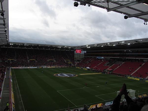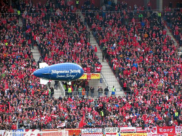 Dadurch, dass wir aus der Stadt kamen, ging der Einlass in den Gästebereich flott, die meisten Frankfurter mussten sich ja von der anderen Seite zum Einlass drängeln. Wir ließen uns durchsuchen, ein humaner Vorgang und wanderten nach oben. Dort trafen wir Stefan und Christian, die hinter Arne, Suse und Muelli standen, die ich eben noch am Ben Gurion Airport in Tel Aviv gesehen hatte. Jetzt also Mainz. Ein kleiner Zeppelin reklamte durchs Stadion, dass eigentlich recht gelungen ist, der Stadionsprecher ging uns ganz traditionell auf die Nerven – letztlich forderte ihn eine ganze Kurve zum Schweigen auf – vergeblich.