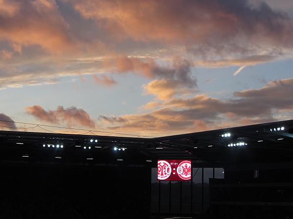 In der zweiten Hälfte blubberte das Spiel vor sich hin, und sehenden Auges schien die Eintracht nachzulassen. Also gut, 0:0 dachte ich und verfolgte die untergehende Sonne. 80. Minute, 82. Minute, 84. Minute – der Eintracht gelang nichts mehr – und es kam, was kommen musste. Flanke Mainz, Kopfball des eingewechselten Choupo-Moting, Tor für Mainz. Abpfiff.