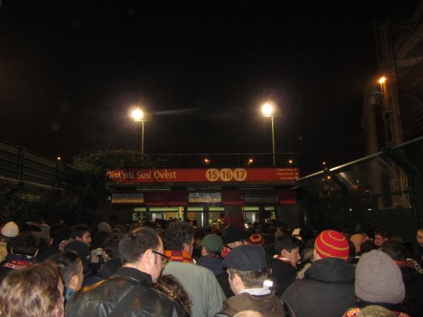 Der Ticketshop war klein und roch wie ein Ticketshop riecht, wenn er seit Ewigkeiten existiert und Tausende sich dort bereits mit Karten für Fußball und Konzerte versorgt haben. Wir mussten unsere Ausweise abgeben, die Namen wurden notiert und unsere personalisierten Tickets vor Ort direkt ausgedruckt. Zehn Euro kostete eines, dazu ein Euro Vorverkaufsgebühr, ein guter Preis; die Karten für das Ligaspiel der Roma am Sonntag sollten das doppelte kosten. Schnurstracks machten wir uns auf zum Bahnhof, Termini, von dort sollte uns der Bus Nummer 910 zum Olympiastadion auf der anderen Seite des Tibers bringen. Schnell noch Fahrscheine besorgt, die Einzelfahrt für 1,50, da der Roma-Pass ab morgen gelten sollte und schon rumpelten wir durch Rom.