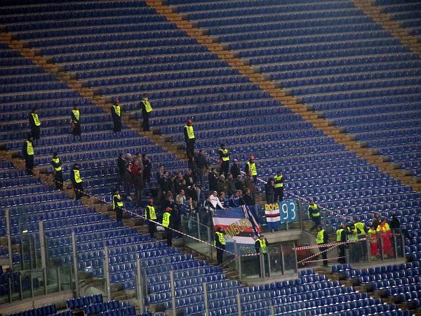 Unsere Plätze befanden sich am Rande der gut gefüllten Heimkurve relativ weit oben, die Übersicht war gut. Ein wenig erinnert das Stadion an unsere Arena, die Bedachung und vor allem die blauen Sitze gaben hierfür den Ausschlag, Logen schien es keine zu geben. Die gegenüberliegende Kurve war komplett leer, nur an der Seite stand ein kleines Grüppchen Genueser, für jeden von ihnen stand ein Ordner zur Verfügung, die sie umstanden.