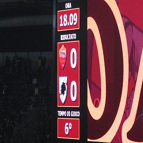 Bei uns wedelten rot-gelbe Fahnen, Juve vaffanculo, Juve merda wurde skandiert, ein bisschen Rauch stieg in die Luft und Knaller böllerten in der Kurve. Teilweise richtig laut, was jedoch scheinbar niemanden interessierte. Kurz nach Anpfiff schien ein Fotograf getroffen, er wurde behandelt und humpelte dann in Begleitung von Sanitätern in die Katakomben. Auch das interessierte niemanden sonderlich. Und kurz nach Anpfiff folgte in der siebten Minute das 1:0 für die Römer. In der Folge entwickelte sich ein einseitiges Spiel, AS Rom spielte auf ein Tor, vergab aber beste Chancen. Die Anzeigetafel zeigte an der Seite den aktuellen Spielstand und die gespielte Zeit an, auf der weitaus größeren Fläche flackerte ununterbrochen Reklame während fliegende Händler Chips und Getränke verkauften. Die Heimkurve supportete, Haupt- und Gegentribüne schwieg.