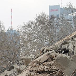 Der Geruch von nassem Staub lag in der Luft, der Schmutz auf parkenden Autos in der Gräfstraße sprach von gestern. An der Baustelle schoben einige Bagger Teile zusammen, Passanten fotografierten, zeigten mit den Fingern auf die Stelle, wo er gestern noch stand. Ein Mitarbeiter der Security-Firma versuchte, Allzueifrige am Betreten des Grundstückes zu hindern. Ground Zero in Frankfurt, harmlos. Nachfolgend ein paar Impressionen vom Tag nach der großen Sprengung. Beim Stadtkind findet ihr übrigens noch eine Sammlung von Aufnahmen der Sprengung.
