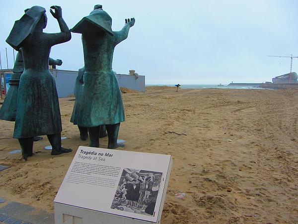 Der Tag begann regnerisch, der 500er Bus brachte uns mit beschlagenen Scheiben zum Praia de Matosinhos, einem Strand Portos an der Atlantikküste. Während in der Stadt stündlich mehr Frankfurter landeten, blieb man hier unter sich. Eine kleine Gruppe um Gisela und Ellen begleitete uns, fuhr aber noch ein Stückchen weiter. Wir blickten auf den Atlantik und entdeckten das Denkmal der verzweifelten Fischerfrauen, welches am Strand an die große Seetragödie von 1947 erinnerte, als 152 Fischer und Seeleute ihr Leben im Atlantik lassen mussten und zig Witwen und Weisen hinterließen. Vier Trawler versanken in den 10 Meter hohen Wellen, nur sechs Seeleute kamen mit dem Leben davon, damals am 2. Dezember 1947.