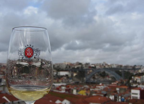 Später rief es von einem Balkon „Beve, Pia“. Wir guckten nach oben, wo Holger fröhlich winkte. Oberhalb des Torre dos Clérigos aßen wir zu Mittag, Carrapau für den Herrn, Francesinha für die Dame, unterwegs trafen wir Gabi, deren Begleitung munter an Doppelhaltern schraubte – unaufhaltsam näherte sich das Spiel, der Auftritt der Eintracht im Estadio do Dragao. Für uns aber stand zuvor noch der Besuch bei Taylor’s auf dem Programm und so nahmen wir die Straßenbahn und sausten über die Brücke nach Vila Nova de Gaia, um nach wenigen Minuten das Anwesen des Portweinherstellers zu erreichen. Gegenüber, am Mannschaftshotel, wartete ein Bus auf das Team Eintracht Frankfurt, während wir den mondänen Vorraum betraten. Für fünf Euro buchten wir eine Führung, drei Gläslein Portwein inklusive und tranken das erste davon auf der Terrasse, unten sangen die Eintrachtfans ihre Lieder.