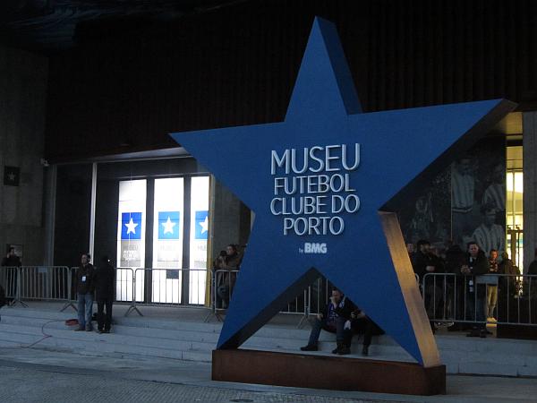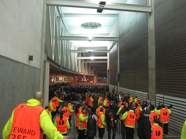 Das Estadio do Dragao schwang sich unmittelbar am Metroausgang in die Höhe, wenige Schritte entfernt entdeckten wir einen Fanshop, der noch Spieltagsschals im Angebot hatte, direkt nebenan lag das Vereinsmuseum, welches aber leider geschlossen hatte. Natürlich war überall ein großes Hallo während sich in der Ferne die von der Stadt gemeinsam marschierenden ankündigten. Den ganzen Tag schon wurde Porto von einem großem Hubschrauber überflogen, unbeobachtet blieben wir nicht. Pia wurde mulmig zumute, nicht ohne Grund, wie wir später erfuhren. Zunächst passierten wir vor dem großen Ansturm die erste Einlasskontrolle, um auf den Treppen weiter oben warten zu müssen. Die Situation hier war entspannt, es gab genug Platz – unten aber drängten nun die Eintrachtler an den nunmehr geschlossenen Eingang, und es wurden immer mehr. Wir hatten Glück, konnten nach einiger Zeit des Ausharrens weiter marschieren, und unsere Plätze einnehmen, die anderen aber, die unten warten mussten, quetschten sich zusammen, da natürlich immer mehr Eintrachtler Einlass begehrten, der ihnen zunächst verwehrt blieb. Später war klar, dass viele von uns erst weit nach Beginn ins Stadion konnten, von Panikattacken und Platzangst wurde berichtet.