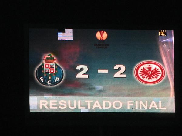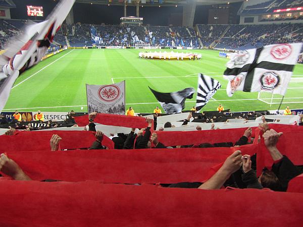 Was nun folgte, wird für alle Anwesenden unvergesslich bleiben, wir steigerten uns in einen Supportrausch und wurden minütlich lauter. Es begann mit einer kleinen Choreo und fand seinen Höhepunkt im minutenlangem Wechselgesang, ein jedes Mal lauter, enthusiastischer, euphorischer, derweil sich die Eintracht gegen spielstärkere Portugiesen abrackerte und doch kurz vor Halbzeit durch einen Kunstschuss Quaresmas das 0:1 kassierte. Die Pausenmusik war erstklassig, der Auftritt der Adler aller Ehren wert. Nach einigen guten Chancen der Eintracht traf Porto zum 2:0 ins Frankfurter Herz, wir begannen zu beten, das wenigstens noch der Anschlusstreffer fällt – und der Fußballgott hatte ein Einsehen, Joselu hämmerte das Ding in die Maschen und als wäre dies nicht genug, hampelte nur wenig später Alex Santo auf Drängen von Marco Russ die Kugel zum Ausgleich ins Netz, wir waren kurz vorm Durchdrehen, während die zwischenzeitlich übermütigen Anhänger des FC Porto nun kleinlaut einen Treffer herbeisehnten, der jedoch nicht mehr fiel – Endstand also 2:2, eine kaum mehr erhoffte Ausgangsposition für unsere Eintracht für das Rückspiel.