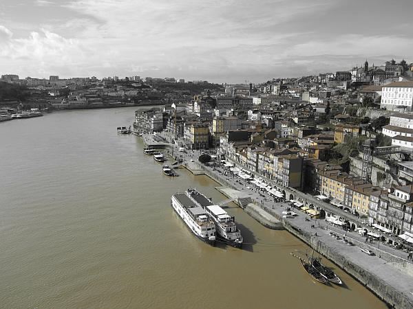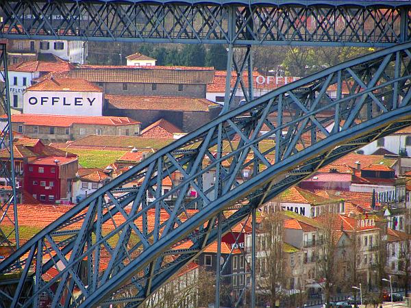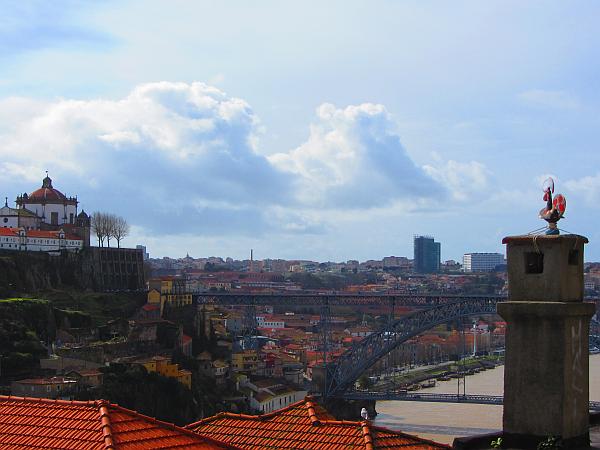 Nach einem kurzen Plausch checkten wir ein, konnten jedoch das Zimmer noch nicht beziehen und so machten wir uns wieder auf die Socken. Zunächst statteten wir unserem Fiat einen kurzen Besuch ab. Zwar wurde direkt vor ihm Schutt auf einen LKW geladen, aber alles schien noch recht in Ordnung zu sein und somit zogen wir beruhigt weiter und landeten an der Markthalle. Obst, Gemüse, eingepferchte Hühner und Souvenirs warteten auf Käufer und auf den Regen, der nun kam. Wir verzogen uns in ein Café gegenüber, um nur wenige Meter davon entfernt sogleich ein weiteres aufzusuchen. Dann führte uns unser Weg an der alten Stadtmauer vorbei in Richtung Landesinnere bis hin zur alten Eisenbahnbrücke Maria Pia. Ich kaufte mir eine Sportzeitung, das Titelbild zeigte einen fassungslosen Spieler des FC Porto und verschwommen dahinter einen weniger fassungslosen Marco Russ. Wir wichen den Kothaufen auf den Trottoirs aus, wunderten uns über die zerfallenen Häuser direkt am Ufer des Douros und blickten von einer anderen Position auf die Stadt, die wir ins Herz geschlossen hatten.