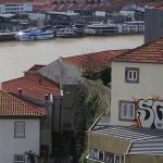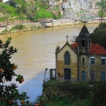 Auf dem Fluss schipperten die Ausflugsbootchen in die nunmehr glitzernde Sonne, ab und an trafen wir auf ausflügernde Frankfurter, die die Stadt auf ihre Weise erkundeten und entdeckten auf einem Schornstein einen festgebundenen Hahn, natürlich keinen Lebenden, sondern den überall präsenten Galo de Barcelos, dessen Geschichte zur nationalen Folklore gehört. Zurück in der Stadt wanderten wir über die Ponte Dom Luis I gemächlich auf die gegenüberliegende Seite, entdeckten ein riesiges SGE-Graffiti dort, wo am Tag zuvor noch keines war, begegneten Susi, die gestern trotz großer Erfahrung am Eingang fast zerquetscht worden wäre, begegneten René, der genau so eifrig fotografierte wie wir und stiegen hinab an den Douro. Hier, direkt am Ufer war niemand unterwegs, vor Orangenbäumen wartete eine kleine Kirche auf ihren Zerfall, zum Teil hatte die Natur die Steine für sich gewonnen, während ich in einer steinernen Nische plötzlich auf Spielsachen stieß, es hatte den Anschein, als handele es sich um einen Altar, vielleicht als Erinnerung an ein Kind, welches hier ertrunken ist.