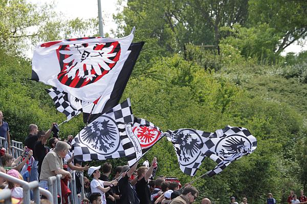 Der Riederwald lag im Sonnenschein, hinter dem Leistungszentrum tummelten sich schon jede Menge Eintrachtnasen im Schatten, die meisten aber hockten auf den Stufen der Gegentribüne. Es dürften schon 1.000 Zuschauer gewesen sein, die im folgenden ein hochspannendes Spiel erleben sollten. Beim Einlaufen der Mannschaften wurden Fahnen geschwenkt, keine Minute später führten die kleinen Bayern mit 1:0. Trotz Anstoß der Eintracht. Alles wie immer könnte man meinen, zumal trotz guter Chancen der Frankfurter nach einer Viertelstunde das 0:2 fiel – das Spiel schien gelaufen, den Münchnern genügte ja schon ein Remis. Da kam Tom zu uns, es sollte die Wende sein.