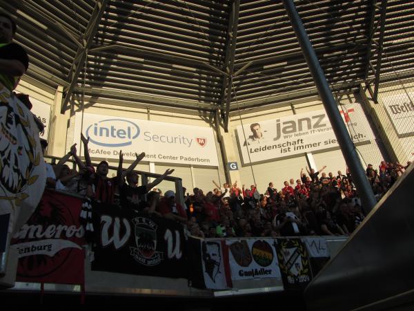 Wir stoppten ein paar Mal zwecks Raucherpause, ich quatschte mit Kroni, Marcel und Matze von Per Sempre, die gleichfalls bei Bühleck pausierten, später wehte der Wind ein Verkehrsschild auf Jules Nase und Niko überlegte kurz, ob wir bei Kassel einen Abstecher zu seiner Mutter machen sollten, verwarf diese Idee aber wieder. Kurz darauf sang Helene Fischer ein Lied, was mich auf die Idee brachte, Pia auf dem Laufenden zu halten, wir passierten zu meiner großen Freude die Abfahrt Beverungen – und schon rollten wir in Paderborn ein, ihr wisst ja wie das ist: Busparkplatz irgendwo vor einem Stadion irgendwo jwd, üblicher Kommentar: Unglaublich hässlich. Bis heute weiß wahrscheinlich niemand, wie das Stadion eigentlich heißt. Es waren schon eine ganze Menge Leute vor Ort, hier parkten die Geiselgangster, wobei mich Gabi daran erinnerte, dass ich in meinem „Scheißblog noch immer nicht ihre tolle Idee von Diamanten gepresst aus der Asche verstorbener SGE-Anhänger aufgegriffen hätte“ und überhaupt was mir einfiele mit einem fremden Bus mitzufahren. Schuldbewusst blickte ich zu Boden und reute vor mich hin. Mario von den Sossenheimern gratulierte mir nachträglich zum Geburtstag, den ich schon fast verdrängt hatte, während Nina von der FuFa alles im Griff hatte. ZoLo stand wie immer vor dem Gästeeingang und beobachtete die Szenerie. Familientreffen in Paderborn also.