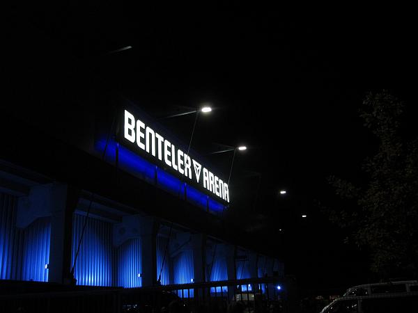 Der Empfang war freundlich, ein Ordner fragte mich, ob ich ein Zigarettenpäckchen dabei habe, was ich verneinte, da ich ja stets Tabak rauche. Da er nicht nach Schnorrer aussah, wunderte mich die Frage, zumal ich nicht durchsucht wurde, worüber ich mich jedoch keinesfalls beschwerte. Dann der beschwerliche Weg nach oben. In Paderborn ist es nämlich so, dass man von unten in den Block kommt und sich dann durch die versammelte Menschenmasse einen Weg nach oben bahnen muss – aber die Eintrachtler waren gut aufgelegt und ich schlängelte mich nach oben. Brüllend laute Musik gellte durch die Blechschüssel, Adi rockte zu Highway to hell, der Abendhimmel zeigte sich in prächtigen Farben und dann ging es los.