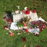 Sonntag Morgen. Matchday. Da Pia nicht so wirklich Lust auf Paderborn hatte, besorgte ich mir vor ein paar Wochen einen Platz im Bus des EFC Bockenheim, Johannes vom Frankfurter Niveau hatte einige Plätze gebucht, und ich war dabei. Und das Schönste: Es versprach ein Sonnenherbsttag zu werden. Da das Spiel erst um 17:30 angepfiffen wurde, ließ sich der Morgen gemütlich an, bis ich mich bei bestem Wetter auf mein Rad schwang und an der Oberfinanzdirektion vorbei kam. Ihr habt ja wahrscheinlich die tragische Geschichte vor ein paar Wochen mitbekommen; nun lagen Blumen, Grablichter und Texte vor dem Gebäude im Gras, in Erinnerung an den Mann, der an gleicher Stelle ums Leben gekommen ist und dessen Geschichte mit meiner verwoben ist, obgleich wir uns nie gesehen hatten. Traurig.