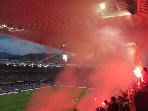 Erstmals seit dem Ende unseres silbernen Golfes saß ich wieder in einem ebensolchen in Richtung Auswärtsspiel. Wir durchfuhren den San Bernadino Tunnel, machten Tags drauf Boxenstop am Wrack der Costa Concordia, verbrachten einen Tag am Meer und sahen zu, wie die Eintracht sang- und klanglos gegen Sampdoria verlor. Auf der Heimfahrt machten wir Halt an der Via Mala und futterten spät in der Nacht in Tübingen Burger.