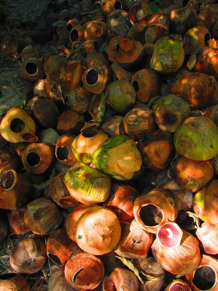 Auf der Insel habe ich die Vielfalt der Angebote noch gar nicht ausprobiert, ich bin ja noch nicht einmal mit der hauseigenen Speisekarte durch. Es gibt viele Gerichte, die auch in der Heimat zu den Klassikern zählen, aber auch einige andere. Neu für mich war die Tamarindsauce, die zu Fisch oder Shrimps serviert wird, wage aber zu bezweifeln, dass diese woanders auch nur annähernd an das heran kommt, was Aew serviert, die Küche ist durchaus gehoben, frische Cashewnüsse aus dem Garten sind schon etwas Besonderes. Aew hat mir zugesagt, bei meiner Abreise einige getrocknete Chillies mitzugeben, vielleicht ernten wir ja noch in diesem Jahr echte Ko Payam Chillies im Seckbacher Garten. Ob die Cashews angehen, wage ich zu bezweifeln, wenn überhaupt dürften sie im Winter nur in der Wohnung überleben. Hinter dem Wohnhaus von Aew und Cha, neben dem Restaurant, befindet sich der Friedhof der Coconutshakes, hunderte ausgeschlürfte Kokosnüsse, die mit der Zeit die weiche grüne Umhüllung verlieren und das übrig lassen, was der gemeine Westeuropäer unter einer Kokosnuss versteht. Ob die beiden hier mit ihnen etwas anfangen, weiß ich nicht, so man sie schneidet und poliert, ergeben sie aber nette Gefäße. Das ist viel Arbeit.