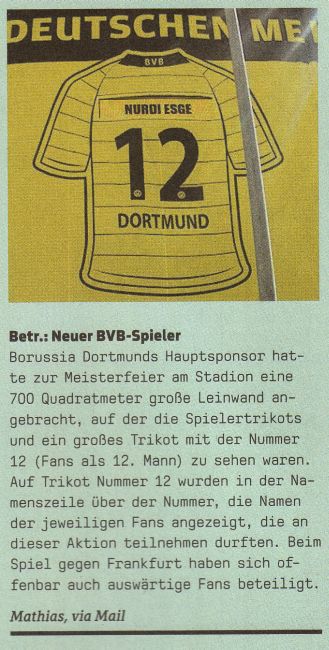 Es war ein trüber Tag, jener 14.Mai 2011. Eintracht Frankfurt stieg durch das 1:3 bei Borussia Dortmund nahezu tasmanisch aus der ersten Bundesliga ab. Dass nicht jeder schon vor dem Spiel den Humor verloren hatte, belegt dieser schöne Leserbrief incl Foto aus der letzten Ausgabe der 11Freunde.